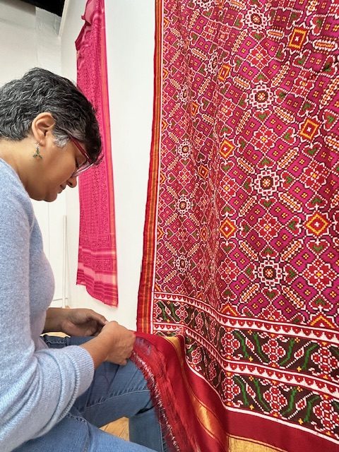 U: Indian Rajkot Patola weavers come to New Jersey and the tri-state area with sarees in their suitcases and sell in person to the Gujarati Hindu and Jain diaspora. Conversely, the diaspora visits India to buy directly from well-known weavers. Also, block-printed and embroidered fabrics, beadings, appliques, etc. from Gujarat may bear similar patterns, and certain motifs (dancing woman, elephant, flowers, pot) are auspicious elements that can be commonly found. You may see these motifs used in a sari or lehenga-choli (blouse-skirt) at a Gujarati wedding or garba dance event, for example. Patan’s patola used to be made for the Gujarati Bohra Muslim community as well and so it is possible that their descendants, if in the U.S., have these as family heirlooms. Older patola pieces, especially double ikat Patan patola, can be found in New York estate sales, antique shops, and museums.