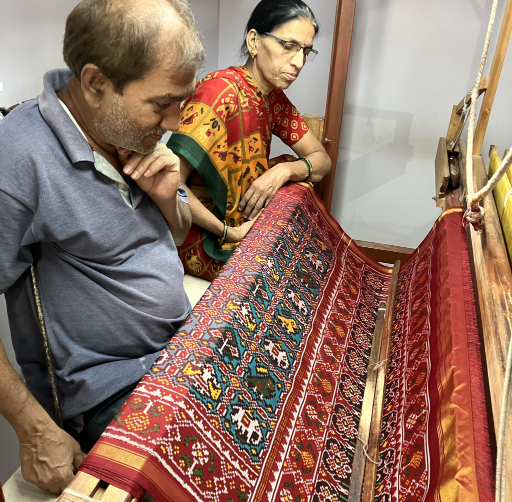 U: Rajkot patola is quite distinctive in many ways although its early history was based on ‘copying’ patterns from Patan patola. Very quickly those patterns were altered for a range of markets and commercialized. But the meaning of commercialization is also contextual and doesn't simply mean that quality deteriorates or that something is unsustainable. In balancing labor with costs, motifs were sometimes simplified, and for a consumption-oriented Indian middle class of the 2000s onward, display value was added through ‘gold’ thread borders, double shade weaves, ‘fusion’ patterns, etc. Probably the biggest innovation is that weavers figured out how to make double ikat fabric on a floor loom and they have a strong market patronized by the rising middle-class and elite. All of this is illustrated by textiles on display in my exhibit [at the Textile Arts Center], and during my talk on March 9th I will share changes in loom technology as well as some kinds of pattern diversification.