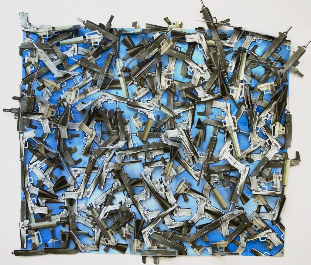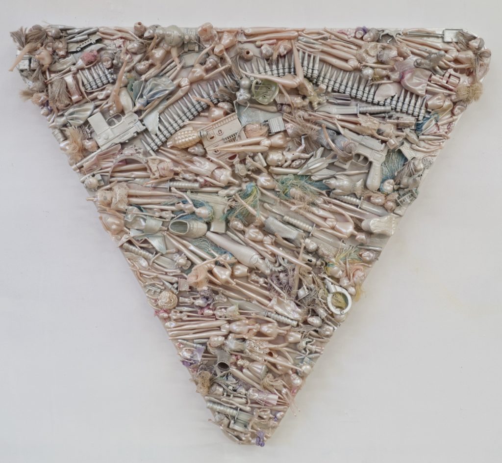 MARGARET: As my children grew up, I became more interested in politics and the world around me. I created seatings for day laborers at an event called the Brewster Project in Brewster, New York. Observing men waiting for jobs inspired me to create seatings with symbols of their countries. This propelled me to start looking outward to what was happening around me. For the Iraq war conflict, I created wall pieces with toy soldiers. I created multiple pieces with children’s toys dealing with consumerism. The Sandy Hook shooting in Newtown, Connecticut occurred near my home and led me to create pieces dealing with gun control and gun violence.