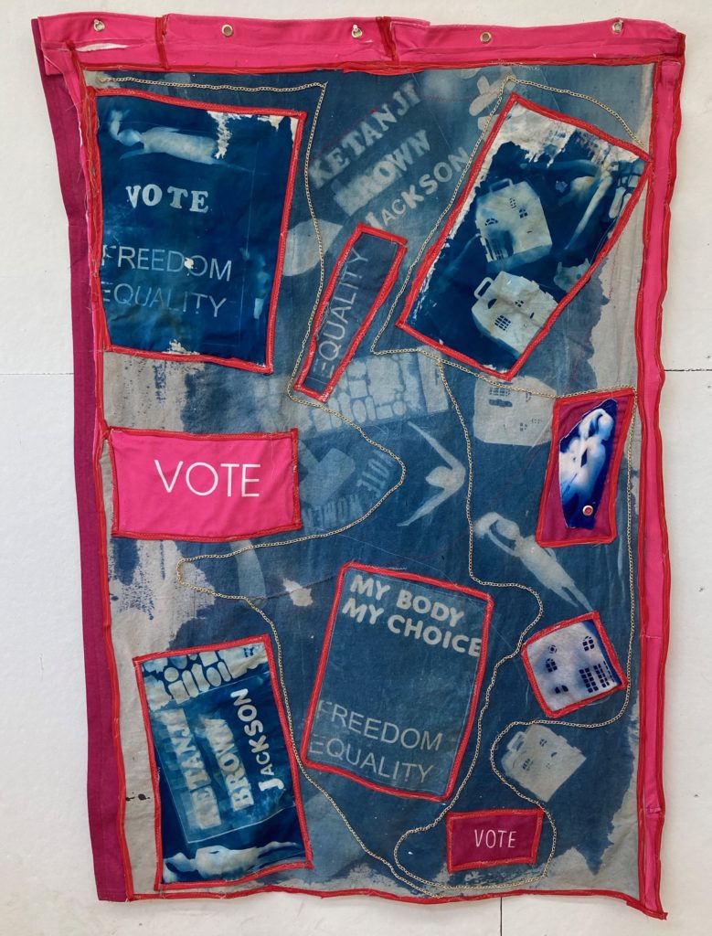 MARGARET: This piece was exhibited at The CAMP Gallery in Miami, Florida in an exhibit held yearly that has the theme ”Women Pulling at the Threads of Social Justice”. I cyanotyped on an old drop cloth, then sewed different materials and stenciled statements about voting. At the time, Ketanji Jackson Brown became the first black woman to serve on the United States Supreme Court. I have created many pieces about violence towards women. The images of houses addressed the lack of safety women experienced in their homes.